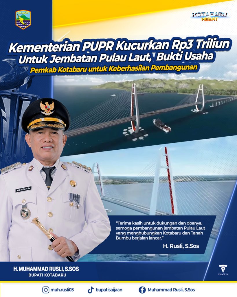 “Perjuangan untuk mendapatkan kucuran anggaran pemerintah pusat akhirnya berhasil, melalui Kementerian PUPR, pembangunan bentang tengah Jembatan Pulau Laut dibantu sebesar Rp3 triliun,” tutur Yasin, Kamis (25/9/25) kemarin.